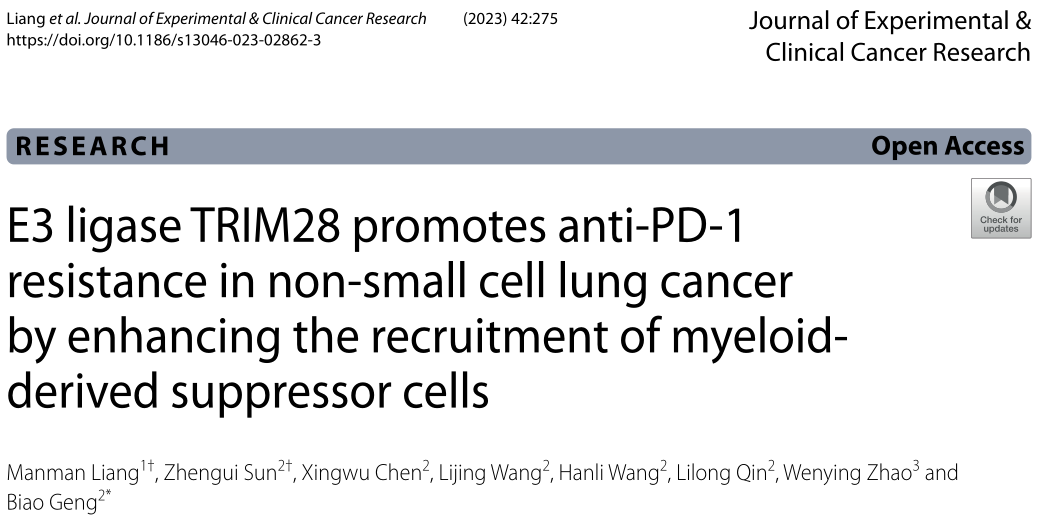 近日,來自皖南醫(yī)學院的研究者們在J Exp Clin Cancer Res.雜志上發(fā)表了題為“E3 ligase TRIM28 promotes anti-PD-1 resistance in non-small cell lung cancer by enhancing the recruitment of myeloid-derived suppressor cells” 的文章,該研究表明TRIM28通過ripk1介導的NF-κB激活,作為趨化因子驅(qū)動的MDSCs募集的啟動子,導致浸潤性活化CD8+T細胞受到抑制,并產(chǎn)生抗pd -1耐藥性。