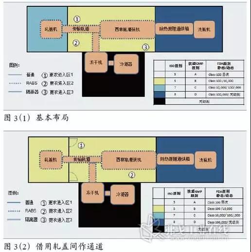 這一方案與方案二有一些類似。但是軋蓋機和灌裝機直接放在同一個B級房間。通過采用隔離器,試圖避免軋蓋過程中粉塵對環(huán)境帶來的污染風險,見圖3(3)。在更衣區(qū)方面的考慮和前一個方案一致。