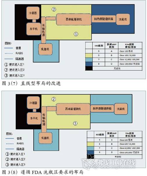 由于所有設施均在一個房間,在生產方面具有很好的聯(lián)通性。通過對環(huán)境要求的降低,也節(jié)約了能耗和運行成本。在環(huán)境控制和相互影響方面,例如除熱原隧道烘箱帶來熱量的發(fā)散、從房間抽取空氣帶來的新風補充問題,以及洗瓶機帶來的濕度控制問題等,需在設計中妥善考慮,但不在本文的討論范圍。